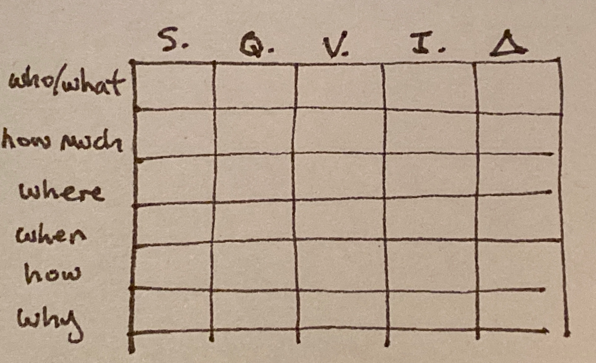 “The word SQVID is a simple mnemonic composed of the first letter of the first word of the […] five questions…. (Note: the V is taken from the Roman U, and the D from the Greek for delta, the symbol of change. So we could say this is both a multilingual and a classical SQUID.🙂)” (Roam, p. 106)