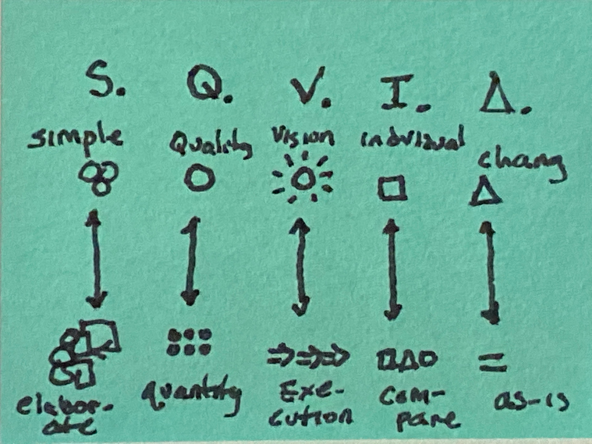“… this pathway through the SQVID forces our visual system to switch gears back and forth as we move from question to question, extreme to extreme. (Try it: I swear you can literally feel your mind’s eye grinding metal as it jumps from qualitative visual description to visionary visual description and so on. It’s a trip.) This shifting of gears in turn exercises corners of our mind’s eye we rarely explore, forcing us to conjure up images that we rarely think of. This pathway is ideal for generating an unexpectedly broad number of ways to visually represent our idea, and leaves us with many views to choose from when it comes time to pick which to show.” (Roam, p. 109)