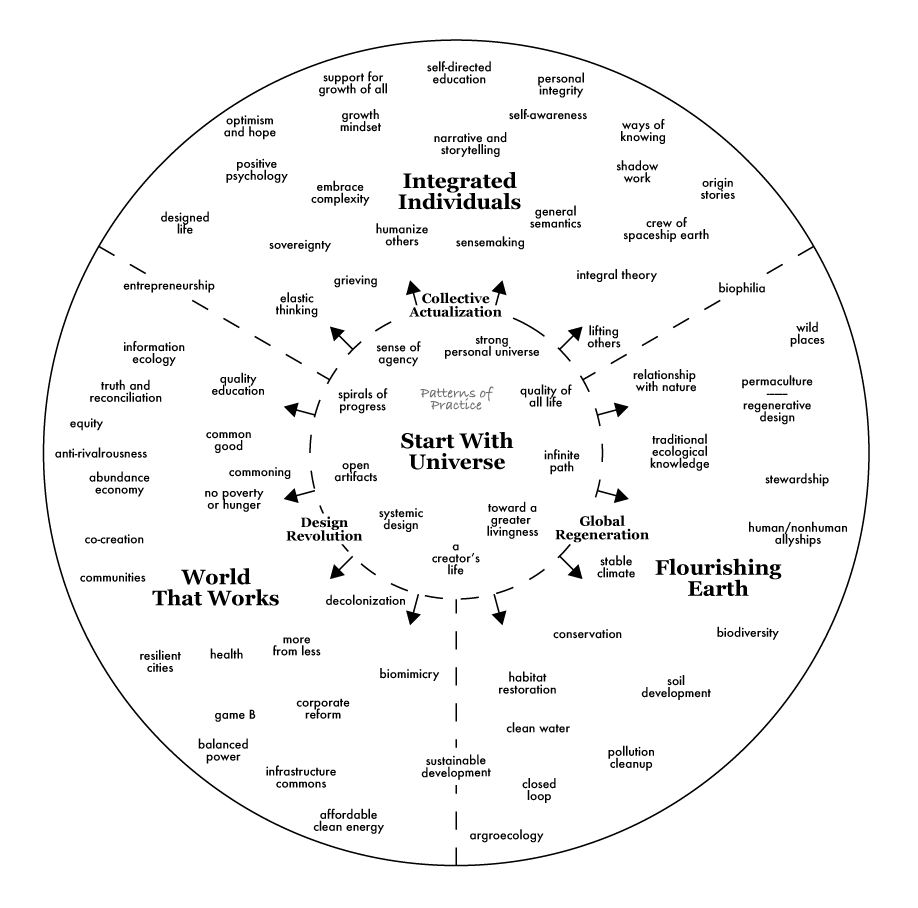 I envision this book as the first in a series of four. Start With Universe is about a creative process that can be used to build a better world. The other books, each named after a pattern in the first book, look at how to apply that process to improve the three main centers of human life that are within our influence: humans, world and Earth. The diagram below shows the first book in the center, driving the development of the three centers. The topics listed are to give a general overview of the topics that would be covered in each book.